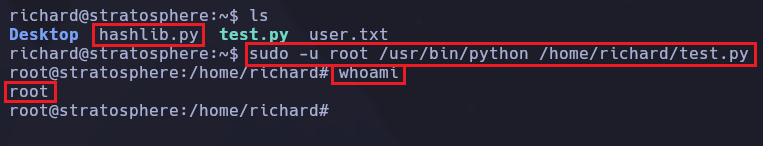 Encontramos un archivo test.py en el directorio /home de richard, noté que dicho script importa la librería hashlib.py por lo tanto aprovechándome de que Python por defecto en primer instancia busca la librería en el directorio actual y luego continúa con el PATH configurado procedemos a crear un archivo llamado hashlib.py en el directorio actual, luego le colocamos el siguiente código.